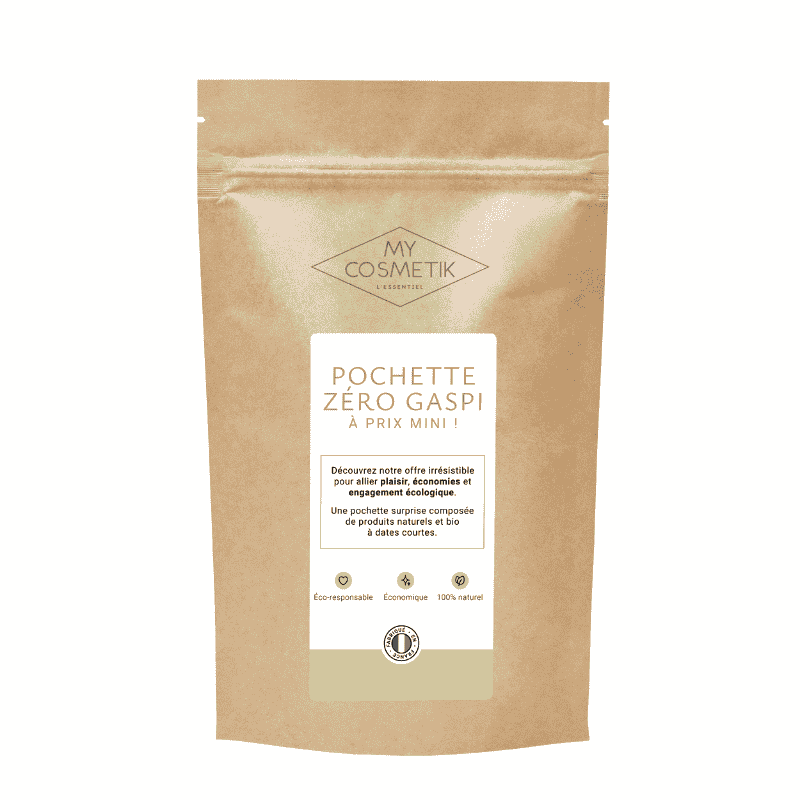Chez MyCosmetik, nous détestons le gaspillage. C’est pourquoi nous avons créé cette Pochette Zéro Gaspi : une surprise composée de produits naturels et bio à dates courtes. Vous profitez d’un contenu d’une valeur minimale de 25 €, pour seulement 9,90 € !