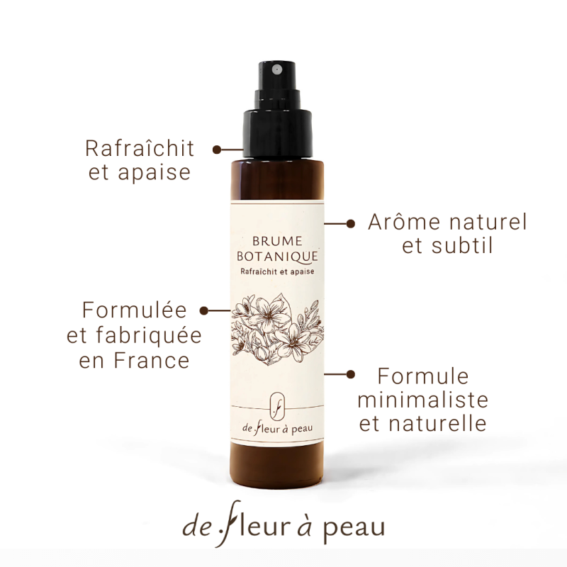 Découvrez notre Brume Botanique rafraîchissante et apaisante, une formule minimaliste, naturellement parfumée et efficace, composée à plus de 99% d’ingrédients naturels : hydrolat de rose, hydrolat de fleur d’oranger (néroli) et aloe vera. Sans parfum ajouté, elle libère un arôme subtil et naturel, tout en offrant une action rafraîchissante, apaisante et hydratante pour toutes les peaux, même les plus sensibles.