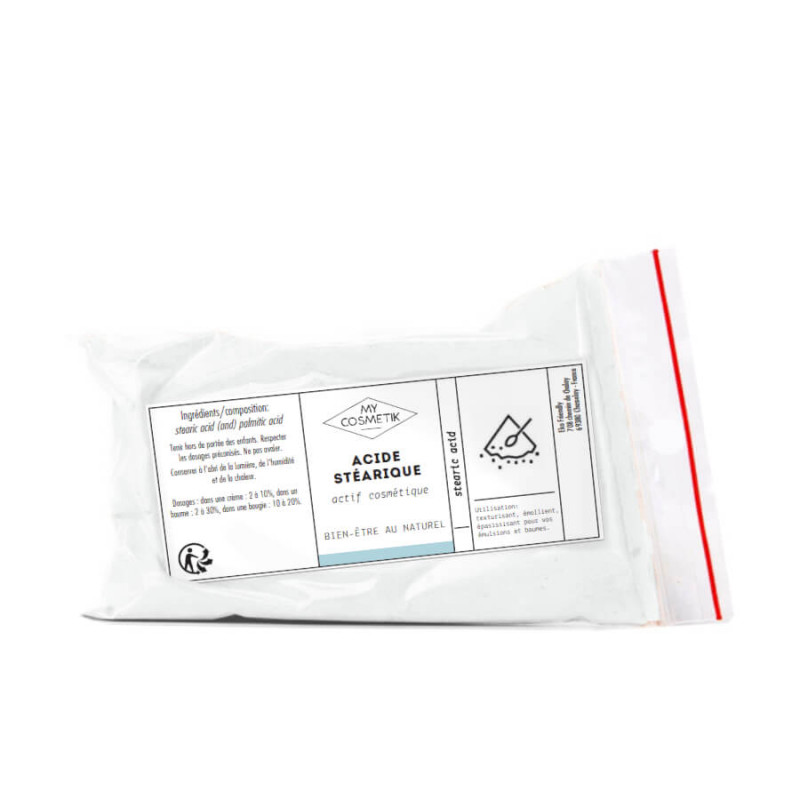 L'acide stéarique est un acide gras présent naturellement dans de nombreuses huiles végétales. Cet agent de texture sert principalement à durcir et texturiser toutes vos préparations huileuses : baumes, sticks, beurres, crèmes, savons ou bougies. Il dispose également de propriétés émollientes, nourrissantes et protectrices (effet filmogène) pour prendre soin de votre peau.