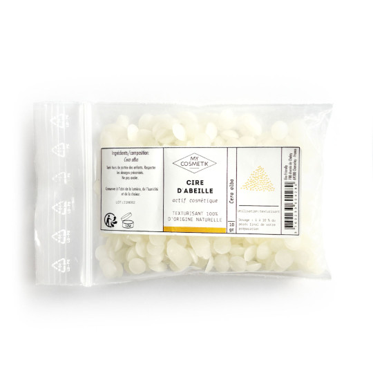 La cire d'abeille offre de très nombreuses vertus. Naturellement composée de vitamine A, de pollen, de propolis (antioxydant, anti-microbiens et purifiant) et de corps gras (nourrissants), elle forme un film naturel, invisible et protecteur sur la peau. Cette particularité présente de nombreux avantages : incorporée dans vos préparations, elle permet entre autres à vos soins cosmétiques de mieux maintenir l'hydratation cutanée.