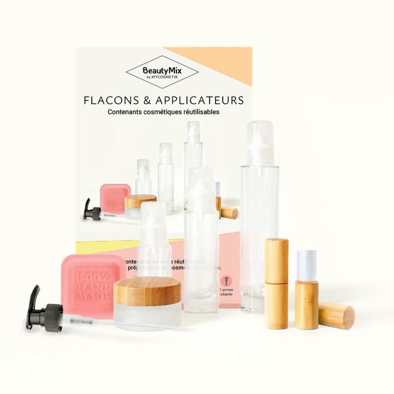 Ce kit comprend : 1 flacon pompe vide 30ml, 1 flacon pompe vide 50ml, 1 flacon pompe vide 100ml, 1 pot vide 30ml, 2 applicateurs baume à lèvres, 1 moule en silicone, 1 pompe adaptable sur nos flacons d'ingrédients.