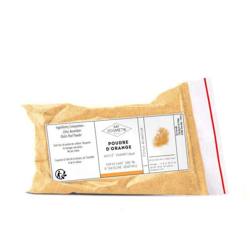 Incorporée dans vos exfoliants, la poudre d'orange douce tonifie et revitalise votre peau. En effet, elle est obtenue à partir de péricarpes d'orange douce séchés et broyés. C'est également de ce péricarpe que l'on extrait l'huile essentielle aux propriétés si intéressantes. Nous retrouvons donc des traces d'huiles essentielles ainsi que de faibles quantités de vitamine C dans la poudre d'orange douce. Enfin, elle possède une propriété astringente, intéressante pour les peaux aux pores dilatés et terne !