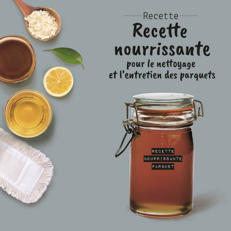 Les sols en bois et les parquets sont souvent des surfaces difficiles à entretenir : ils se tachent, se rayent et craignent l’eau et l’humidité. Cette recette très concentrée, désinfecte, nettoie, protège et fait briller tous vos parquets et stratifiés. Nettoyante grâce au savon noir, protectrice grâce aux cires et huiles végétales, antiseptique grâce à l’huile essentielle, elle s’utilisera toujours mélangée avec un peu d’eau pour ne pas tacher les parquets et pour augmenter l’efficacité nettoyante.
