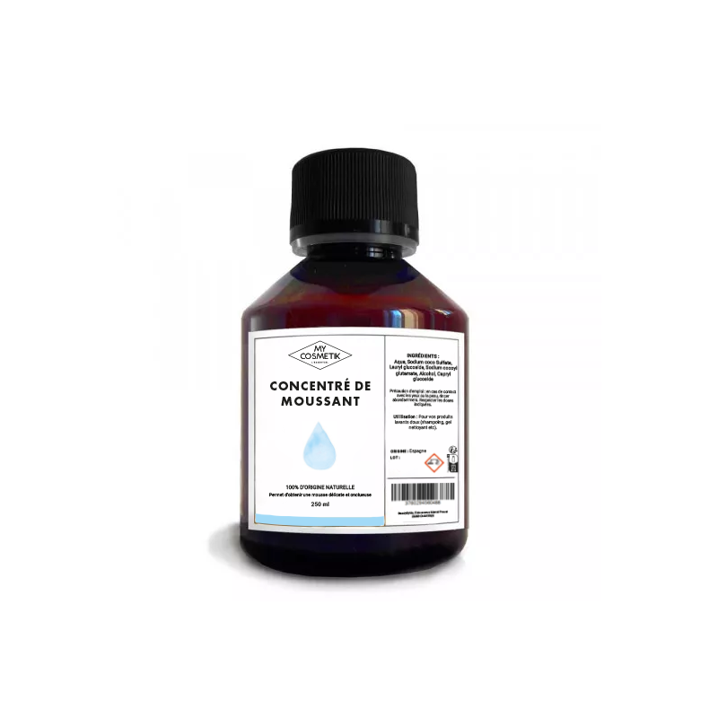 Notre concentré de moussants est un mélange de tensioactifs spécialement formulé pour servir de base à vos recettes de produits lavants. Grâce à sa structure moléculaire, un tensioactif remplit avec succès plusieurs fonctions. Tout d’abord c’est un nettoyant. Il dissout et décolle les impuretés graisseuses qui se mélangent ensuite à un liquide (généralement de l'eau) afin d’être évacué par rinçage. Notre concentré de moussants se distingue par sa douceur (ses composants sont d'origine naturelle et doux pour la peau et les cheveux), et sera l'allié au quotidien des cuirs chevelus et des peaux les plus sensibles. La seconde particularité de notre concentré de moussants est son pouvoir moussant exceptionnel : il permet à vos préparations cosmétiques de produire une mousse fine, douce, enveloppante,... et abondante.